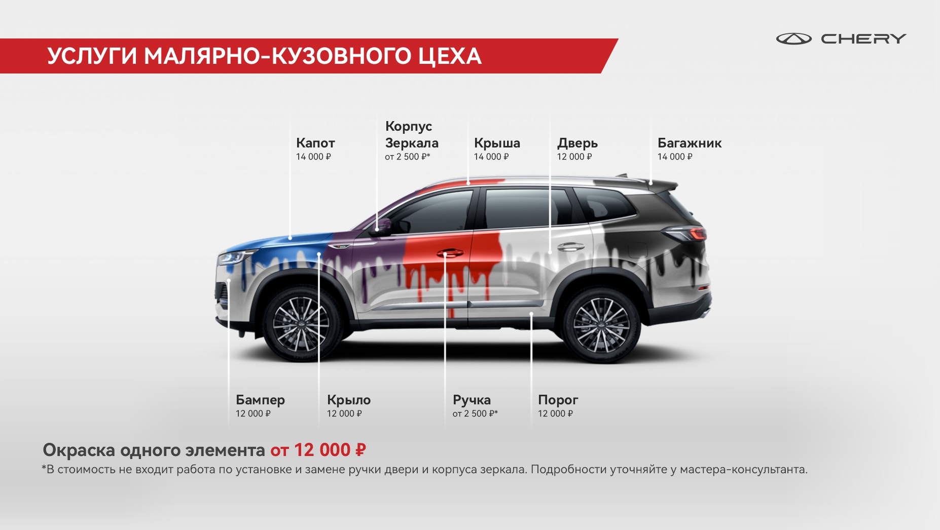 - Окраска одного элемента (дверь, крыло, бампер) - от 12 000 рублей!